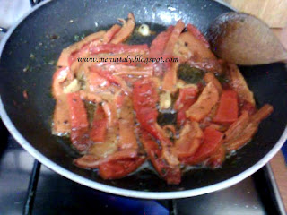 2. In un tegame con olio soffriggere l'aglio schiacciato insieme con le alici. Appena sciolte nell' olio, unire i peperoni, precedentemente arrostiti, spelati e tagliati a falde piccole. Aggiungere il basilico spezzato con e mani e un po dell'acqua della pasta.