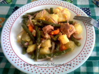 Ingredienti principali sono le patate lessate, fagiolini lessati, tonno al naturale o sottolio, però sgocciolato molto bene, immancabile olio d'oliva extra vergine e ..  chi più ne ha più ne metta!