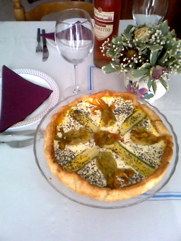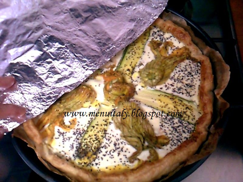 Bucherellare la pasta sfoglia precedentemente stessa in una teglia sulla sua carta e riempirla con il composto (ripieno) di ricotta. Adagiare sopra le zucchine tagliate a lungo e i fiori puliti dal loro picciolo. Cospargere con i semi di papavero e spennellare con il tuorlo le parti esterne della sfoglia.