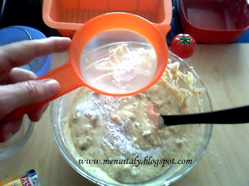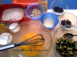 2. Continuare aggiungendo la farina (poca alla volta), il parmigiano, l’altro formaggio semi stagionato di gusto più dolce (come Asiago), i pomodori secchi (rinvenuti precedentemente in acqua calda), parte delle olive tagliate a pezzetti ed in fine i cubetti delle zucchine precedentemente saltate in padella con pochissimo olio d’oliva (un cucchiaio).