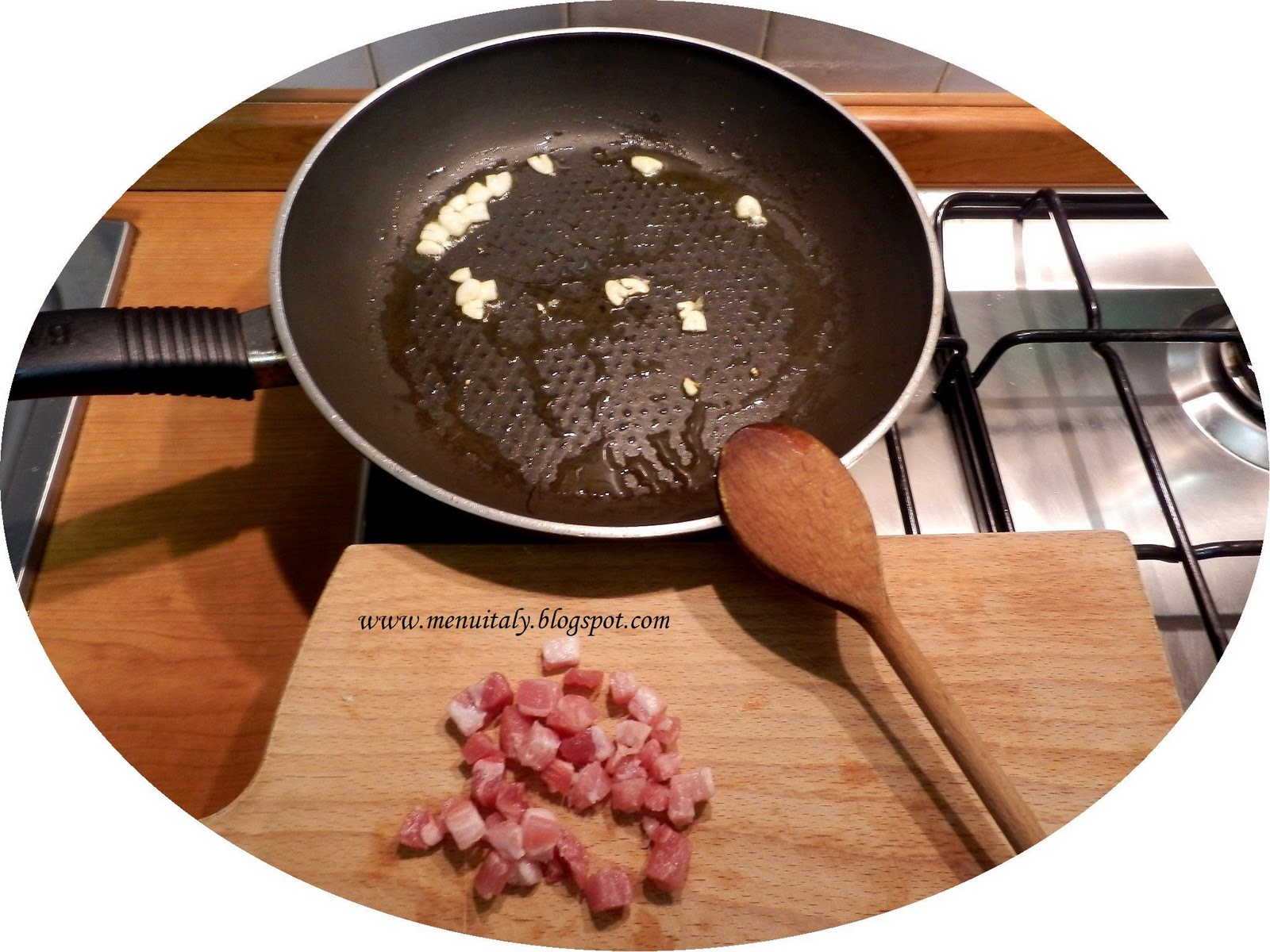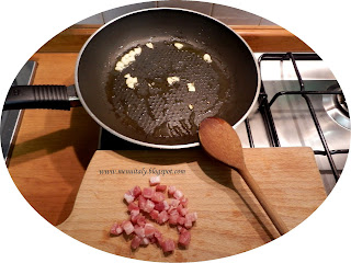 2. In una pentola con l’aqua bollente e salata unire la pasta e cuocerla al dente. Far imbiondire uno spicchio d’aglio tagliato a pezzetti in pochissimo olio e unire la pancetta affumicata tagliata a dadini. Se non si vuole usare l'aglio, procedere direttamente al passo no. 3.