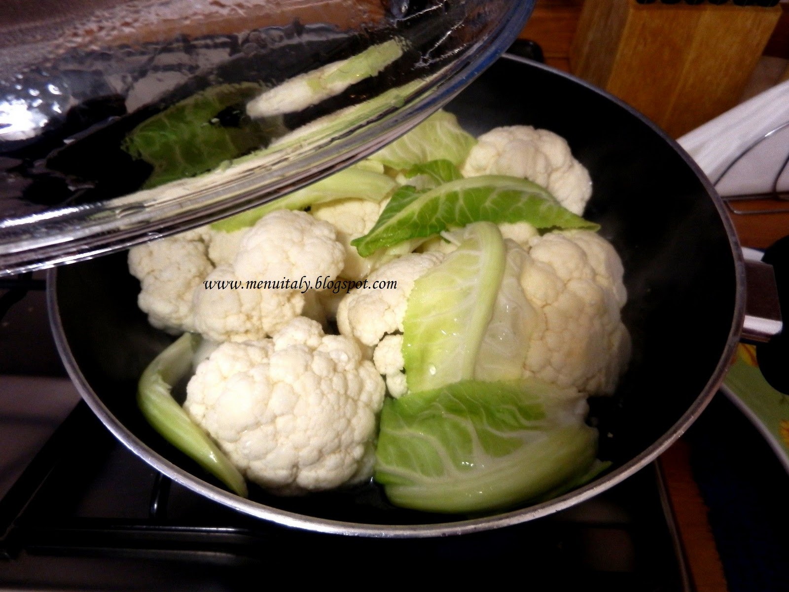 1. Cuocere in poca acqua bollente o al vapore i grossi pezzi di cavolfiore, solo 10-12 minuti.