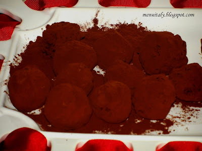 Nota: Questi tartufi di cioccolato possono stare in frigo per un paio di settimane oppure si mettono nel congelatore per un paio di mesi. Prima di servire metterli nei pirrotini e portarli a temperatura ambiente.