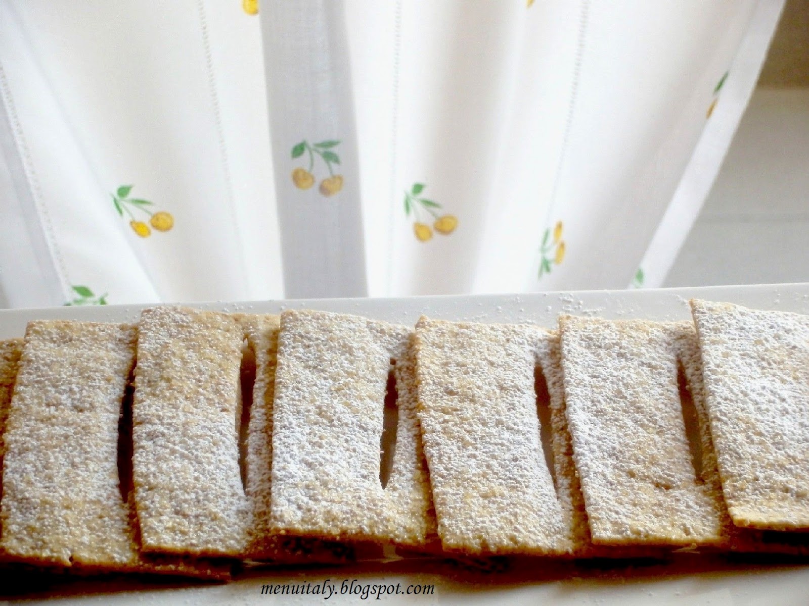 Fra due giorni festeggio il primo compleanno di questo blog! In onore di ciò, oggi pubblico un' altra ricetta delle Chiacchiere o Bugie, però questa volta cotte al forno! La ricetta porta lo stesso nome, le bugie hanno stessa forma delle sorelle fritte pubblicate nel primo post però, hanno fragranza e friabilità decisamente diverse e un altro piacevole gusto, sono molto più leggere e più sane. Praticamente sono dei biscotti golosi preparati con un mix di farina 00 e farina integrale, l’olio di oliva extra vergine e vino bianco.