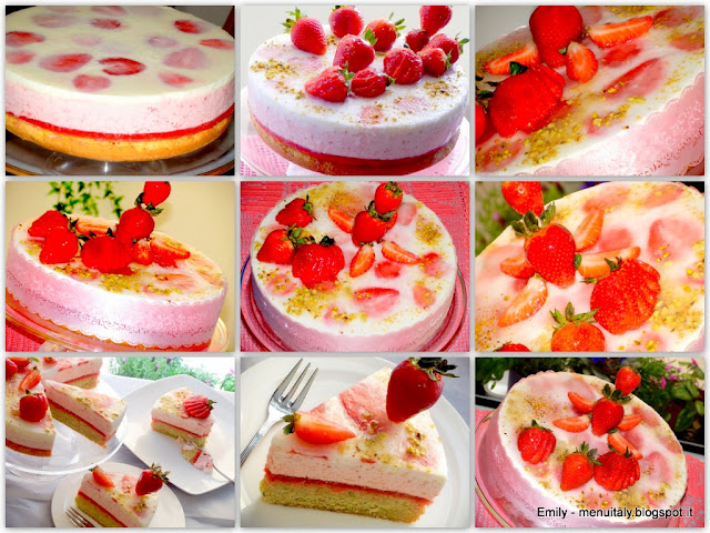 Per il mio compleanno appena passato, volevo una torta leggera ma anche fresca, colorata al tempo stesso e allora ho pensato ad una Bavarese alle fragole, la mia frutta preferita! Ma così semplice, senza una base non mi sembrava una vera torta, quindi l'ho arricchita con una "genovese alla polvere di pistacchi" e il Gelé di yogurt e fragole (questo ultimo prestato dalla torta “Giardino di fragole” dal grande maestro pasticcere Luca Montersino.