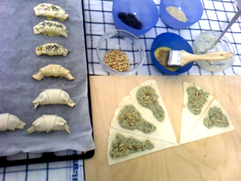 Con un cucchiaino mettere un po del ripieno su ogni triangolo di pasta, un po di pinoli sopra e fare un cornetto chiuso per non far uscire la farcia.