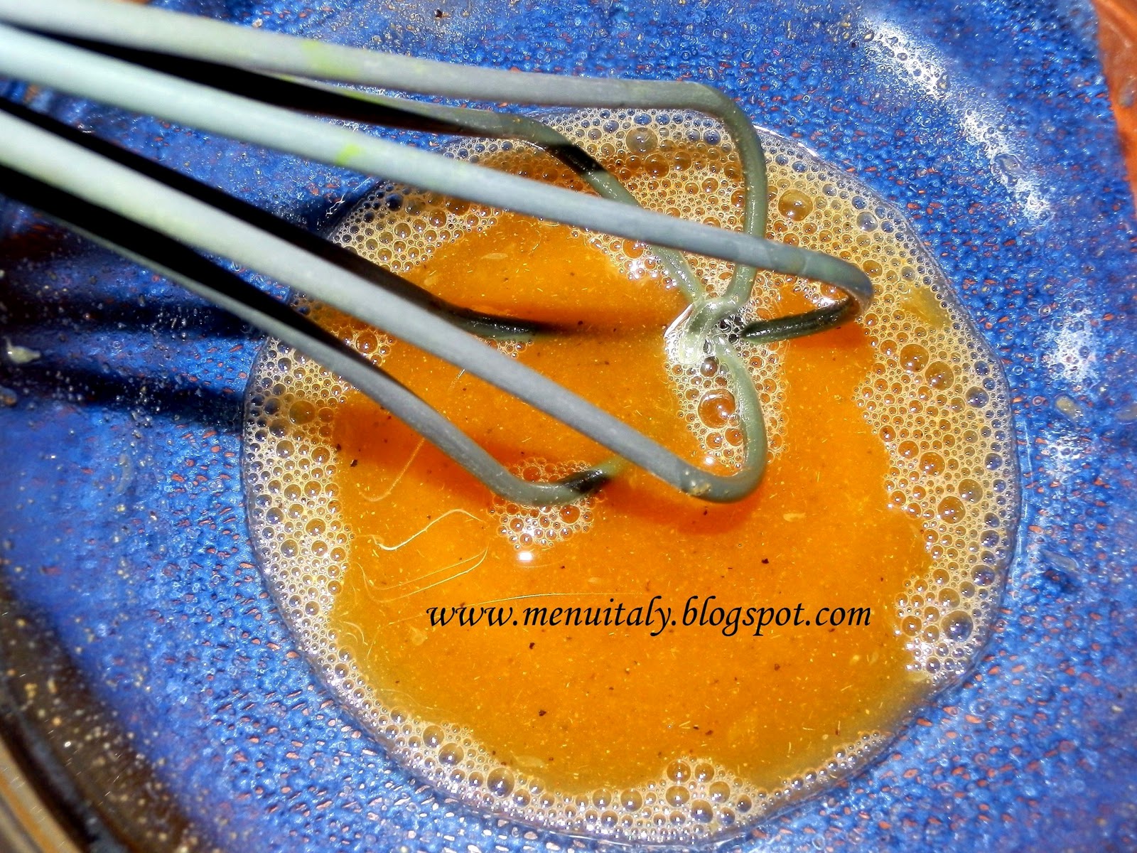 2. In una ciotola versare il succo di un’arancia e mezzo, il miele, l’aceto, lo zenzero, sale, pepe e sbattere con la frusta.