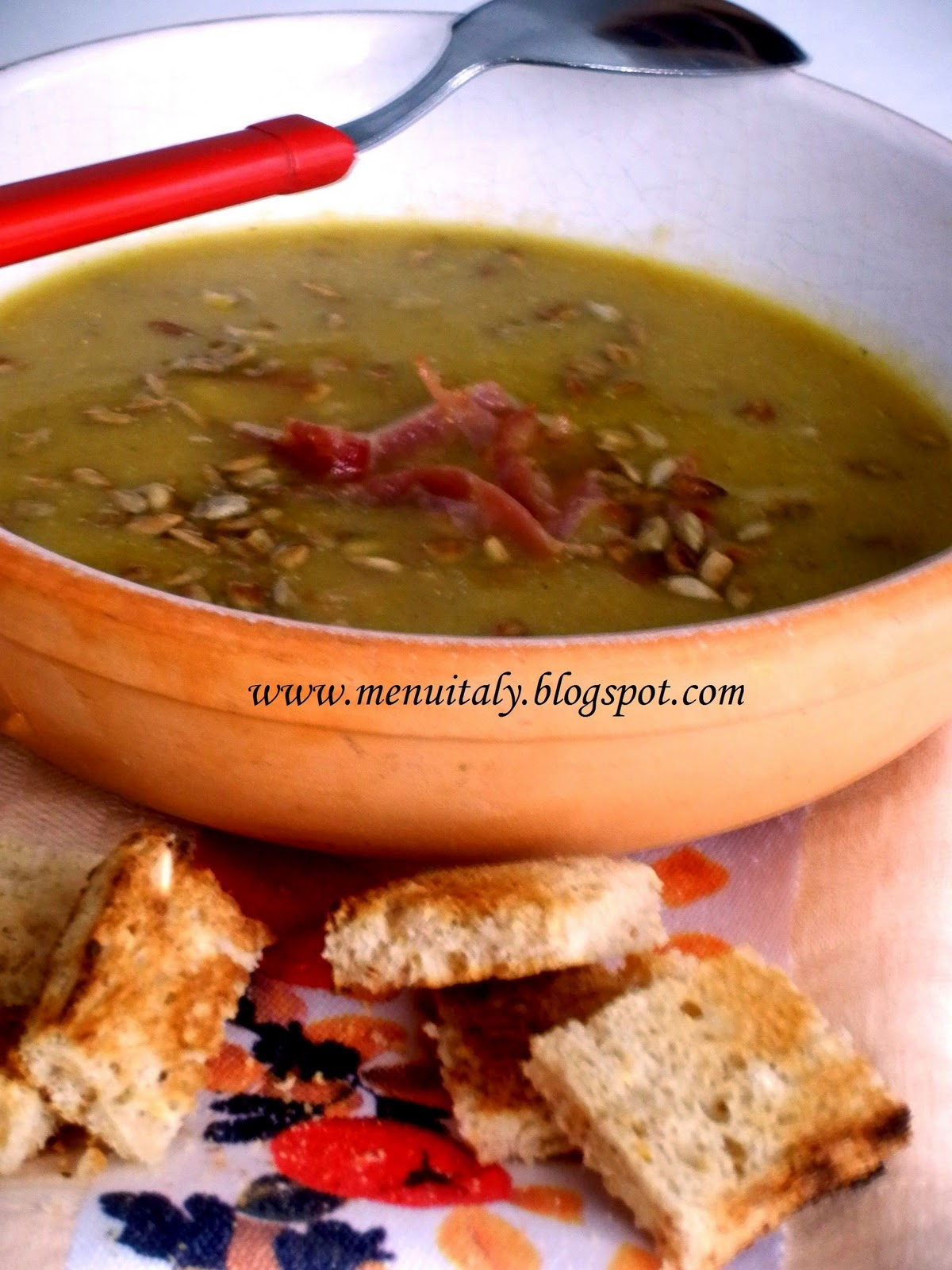 Ora cari, passiamo alla ricetta per oggi: Crema di lenticchie con semi di girasole e speck.